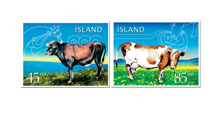 The Icelandic cow is the breed which was brought to the island in settlement times, unchanged by mixed breeding over the centuries. The bull, to the left, appears in the myth of Þór (Thor) and the giant Hymir, when the thunder god uses the head of an ox as bait to fish the world serpent, Jörmungandr. The myth on the right features the primal cow Auðhumbla, who plays an essential role to the awakening of life.